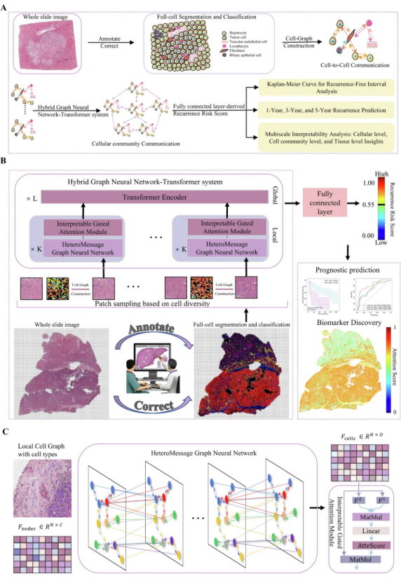 2025年7月25日,伟德国际1949始于英国金成团队在《npj Precision Oncology》发表研究成果,提出了一种结合细胞图神经网络与Transformer的新型AI架构——Hybrid Graph Neural Network-Transformer system (HGTs),该系统首次实现了全切片级别的细胞实例分割与分类识别,并精准预测肝细胞癌(HCC)患者术后局部复发风险。该研究基于387例HCC患者、6个独立队列、57位临床病理专家协助完成,展示了人工智能在多尺度肿瘤异质性建模与空间生物标志物发现中的巨大潜力。传统像素级视觉处理方法难以捕捉数百万级细胞实体在肿瘤组织中的复杂部署与形成策略。HGTs系统突破性地实现了从细胞-细胞、细胞-群体,到组织层级的多尺度交互建模,显著优于现有SOTA方法,在融合临床与IHC信息后,C-index达到0.823,较基线提升23.1%。该研究还发现并量化了一组空间关系标志物,如肿瘤-淋巴细胞交互频率、关键细胞群体的稀疏度与分布模式、以及瘤周组织的纤维化程度等,揭示了其对复发风险的决定性作用,并初步探索了该标志物组合的免疫治疗潜力。