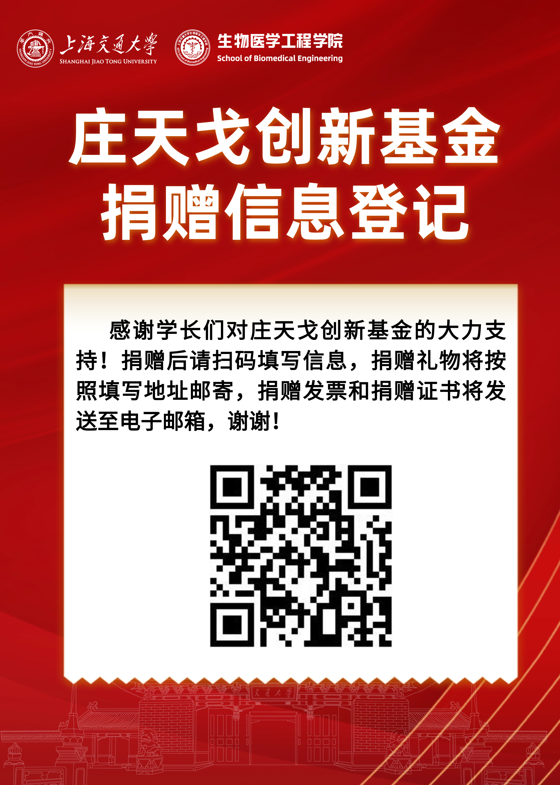 我们倡议建立“庄天戈创新基金”,以此鸣谢庄老师对生物医学工程团队建设、教书育人、科研创新的突出贡献,并为生物医学工程的创新打造一个支持的平台, 建立起员工与在读生的纽带。