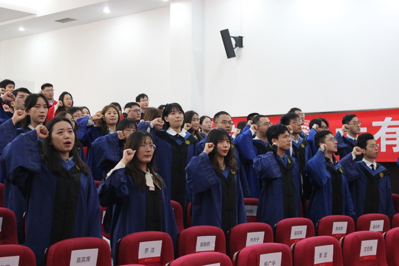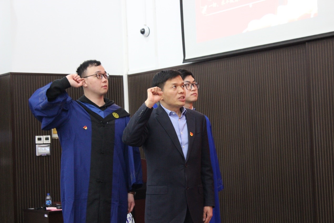 接下来,季波书记为毕业生党员佩戴党徽,与全体同志面向党旗,重温入党誓词。同志们铿锵有力的声音在会场回荡,庄严而神圣,深刻表达了一名共产党员践行初心使命、用力时代潮头的勇气和决心。