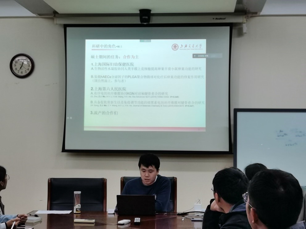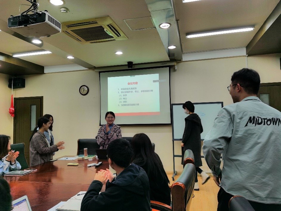 接着,会议进入了毕业生的升学、选调和求职经验分享环节。马之杰学长结合自己的科研经历为大家分享了自己想要转博的原因以及博士和硕士在科研学习上的区别,并向同志们分享了转博的一些经验,并告诉大家“博士期间科研压力增大,大家一定要注意养成良好的生活习惯,毕竟身体是革命的本钱。”