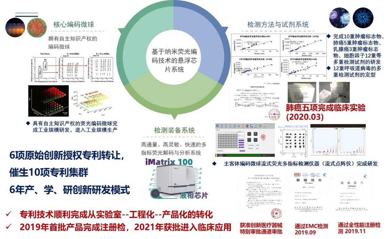 联合实验室首批代表性成果是以上海交大团队在纳米颗粒可控制备、表面修饰、纳米颗粒与生物分子相互作用等核心技术为基础,发展出新型多指标检测平台技术——基于纳米荧光编码技术的悬浮芯片多指标检测系统,并分别以核酸和蛋白为待测靶标分子实现了单管多重指标联合检测,首批产品进入创新审批,并已完成注册检验与临床试验,拟于2021年上市获得应用。后续第二批代表性成果业已完成试生产,即将进入注册阶段。