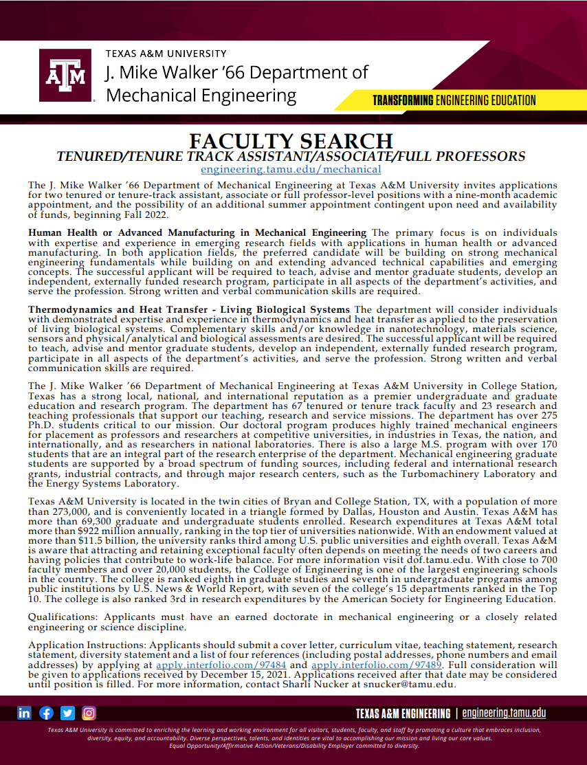 海外长聘系列教职岗位招聘——Texas A and M University (Texas, United States)