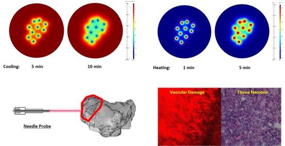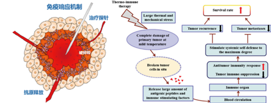 Prof. Lisa X. Xu's team is the first to propose the concept of thermophysical immunotherapy for metastatic solid tumor therapy. Through the precise control of a hybrid thermal process involving rapid LN2 cooling, followed by rapid radiofrequency heating, sufficient thermal and shear stress are generated to completely disintegrate the tumor cells and the newly formed tumor vessels. The sub-lethal temperatures are used to permit the maximal release of viable tumor antigens and molecular damage factors. The immunogenic death of tumor cells stimulated the response of antigen presenting cells, reversed tumor immunosuppressive microenvironment, and activated the CD4+ T cell-dominant neoantigen-specific immune response. The induced antitumor immune response can inhibit the recurrence and metastasis of solid tumors. The device for multi-mode thermal therapy is currently undergoing multi-center clinical trials.