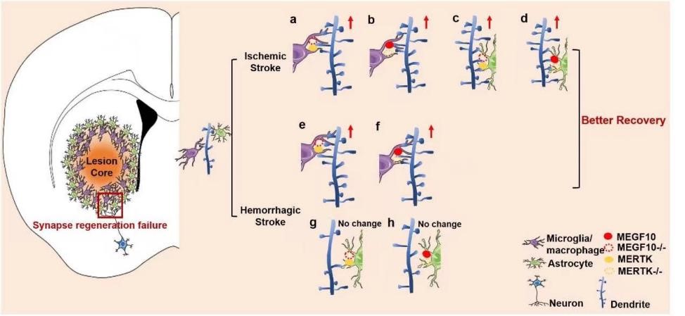 该工作利用啮齿类动物脑血管疾病模型,探索小胶质细胞/巨噬细胞(microglia/macrophage)和星形胶质细胞(astrocyte)在缺血性卒中和出血性卒中修复阶段的突触吞噬情况。研究发现两种胶质细胞在脑缺血(ischemic stroke)小鼠中过度激活从而吞噬神经突触,使得突触丢失影响了疾病预后;而在脑出血小鼠中只有小胶质细胞/巨噬细胞过度激活介导突触吞噬,星形胶质细胞无明显作用。采用条件性基因敲除小鼠。通过免疫电镜、高尔基染色等技术证明了反应性胶质细胞是通过MEGF10/MERTK 吞噬通路对胶质增生区域的突触前膜和后膜进行吞噬。单细胞测序分析进一步发现了与缺血性卒中相比,出血性卒中后介导神经突触吞噬的星形胶质细胞亚群数量明显降低。所有这些结果都提示了在卒中修复期,胶质细胞可通过MEGF10 和 MERTK这两个关键分子吞噬神经突触,导致神经突触丢失和神经环路破坏,最终造成神经功能障碍。