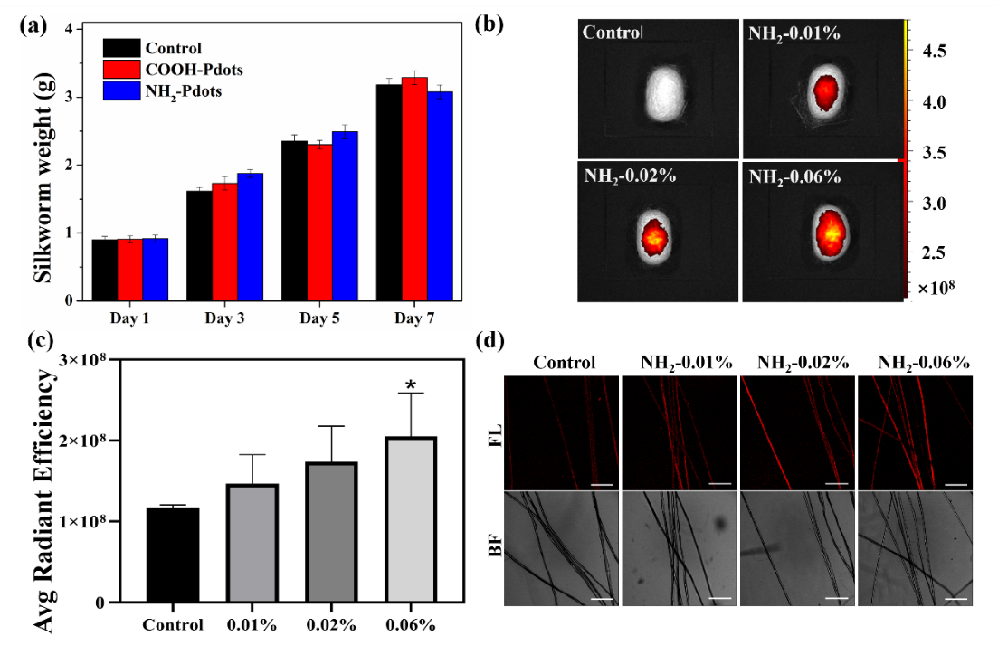 图2. a.添食育蚕过程中五龄期家蚕体重变化 b-d.超低剂量共轭聚合物纳米探针添食法制备出来的蚕茧及脱胶丝的荧光性能