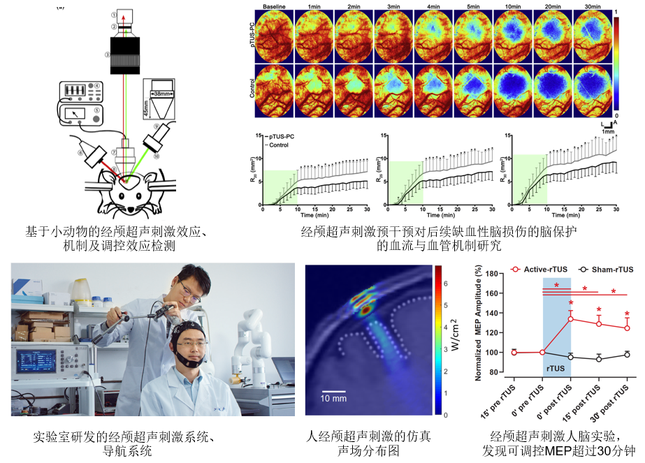 (1) 经颅超声刺激技术及应用。 实验室在经颅超声刺激方面进行了系列动物研究和人脑脑功能研究,相关结果发表于Brain Stimulation (2017),IEEE Transactions on Biomedical Engineering (2015, 2019),iScience (2021),研发了经颅超声刺激系统和导航系统,已获得4项发明专利授权。
