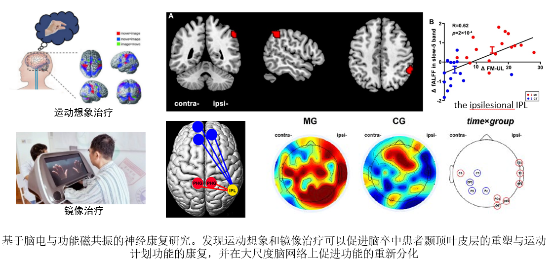 (3)神经影像与康复工程。 运用心理物理、脑电、磁共振等神经影像分析方法,研究脑卒中康复、认知、冥想、亲子交互等神经机制,相关成果发表在NeuroImage, Cerebral Cortex, Neurorehabilitation and Neural Repair等神经影像与康复领域期刊。