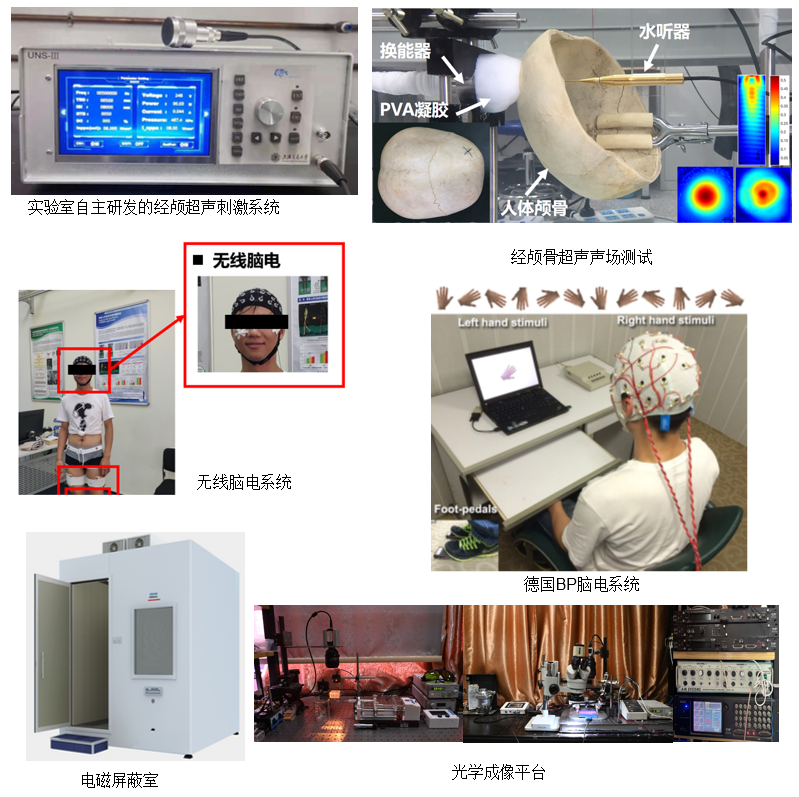神经工程实验室具有先进的实验研究平台设备,包括多通道脑电采集及分析系统、经颅超声刺激系统、经颅超声刺激导航系统、声场测试系统、硬件研发和测试系统、神经光学成像系统,以及相关的神经影像计算平台等。