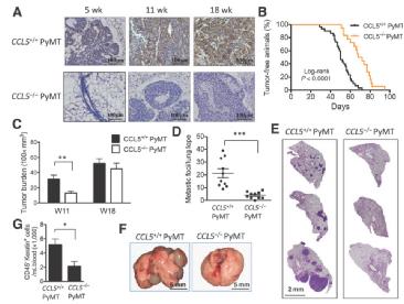 他们发现, 在乳腺癌小鼠模型中, CCL5表达水平随着乳腺癌的进展逐渐升高。通过调节肿瘤相关髓样细胞的特性,CCL5促进乳腺癌细胞的侵袭。 CCL5诱导了Th2 CD4+ T细胞的极化, 最终促进了乳腺癌的肿瘤发生和肺转移。在此过程中, CCL5与表达在CD4+ T细胞上的受体CCR3结合,通过IL4-Stat6信号通路增加了转录抑制因子Gfi-1的表达;在乳腺癌临床病人中, 肿瘤组织和血清中CCL5的含量都与疾病进展呈正相关的关系。这项工作从免疫的角度揭示了乳腺癌肿瘤发生和肺转移的分子机制。