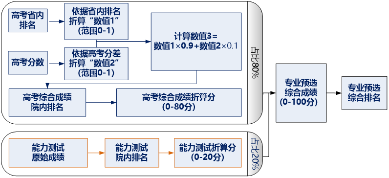 专业预选综合成绩=高考综合成绩折算分+能力测试成绩折算分
