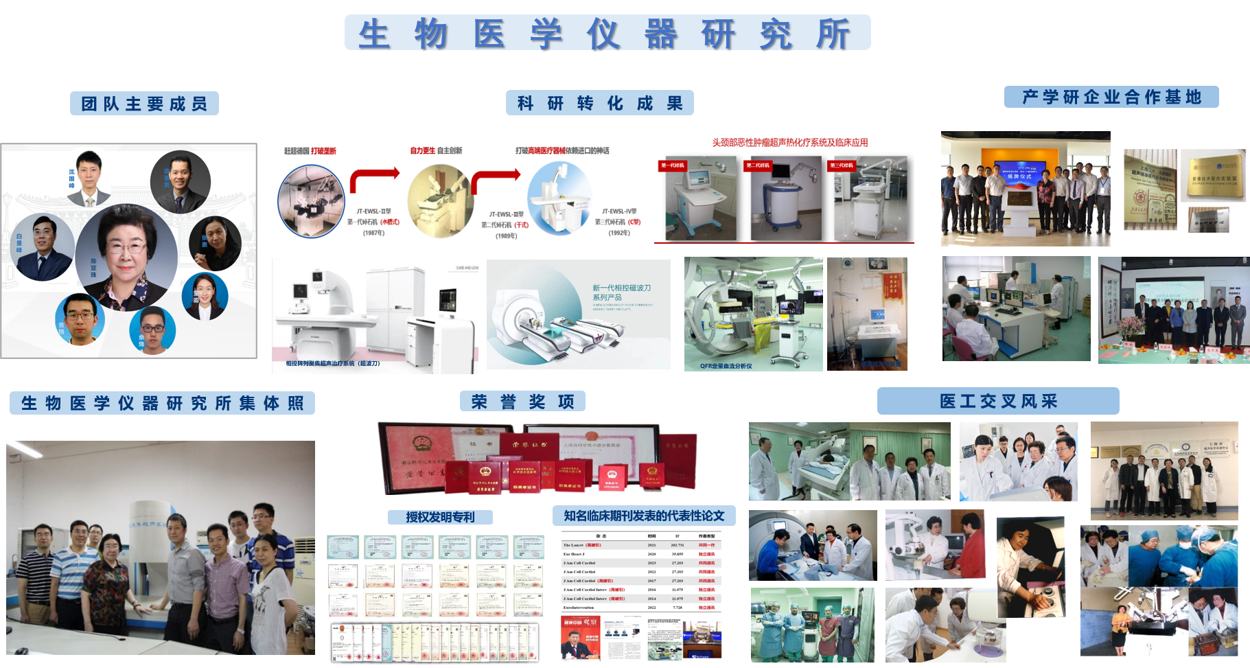 上海交通老员工物医学仪器研究所成立于1997年7月,由我国跨学科“医工交叉”先行者陈亚珠院士创建并担任所长。研究所主要成员包括执行所长白景峰研究员、研究员沈国峰、特聘教授涂圣贤、副教授张素、工程师吉翔、助理研究员楚淼、助理研究员余炜。