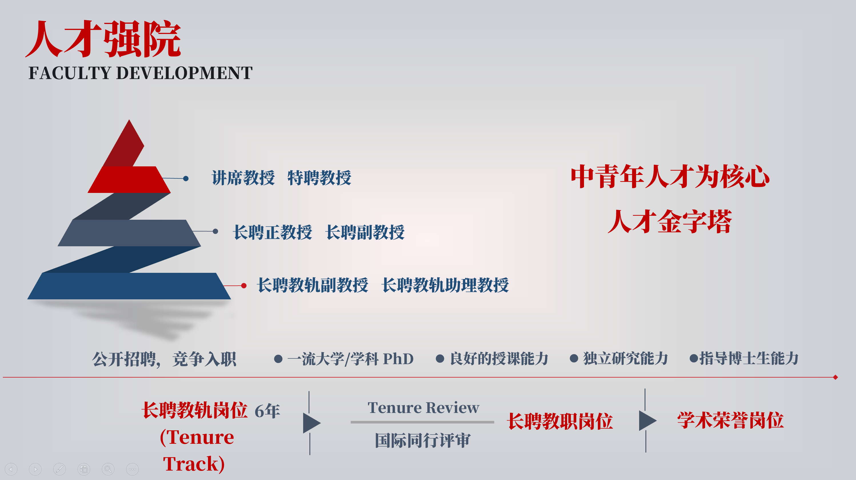 发展环境:与国际接轨的长聘体系,营造人人皆可成才、人人尽展其才的引育环境,提供自由宽松的学术空间,助力青年人才的成长和发展。