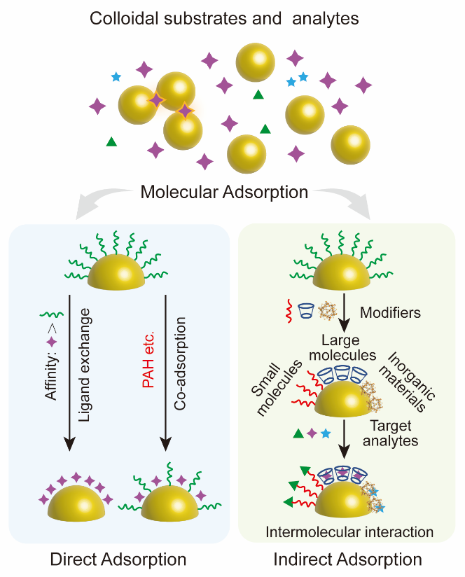 图1. SERS液相胶体基底与待检测物的相互作用方式。