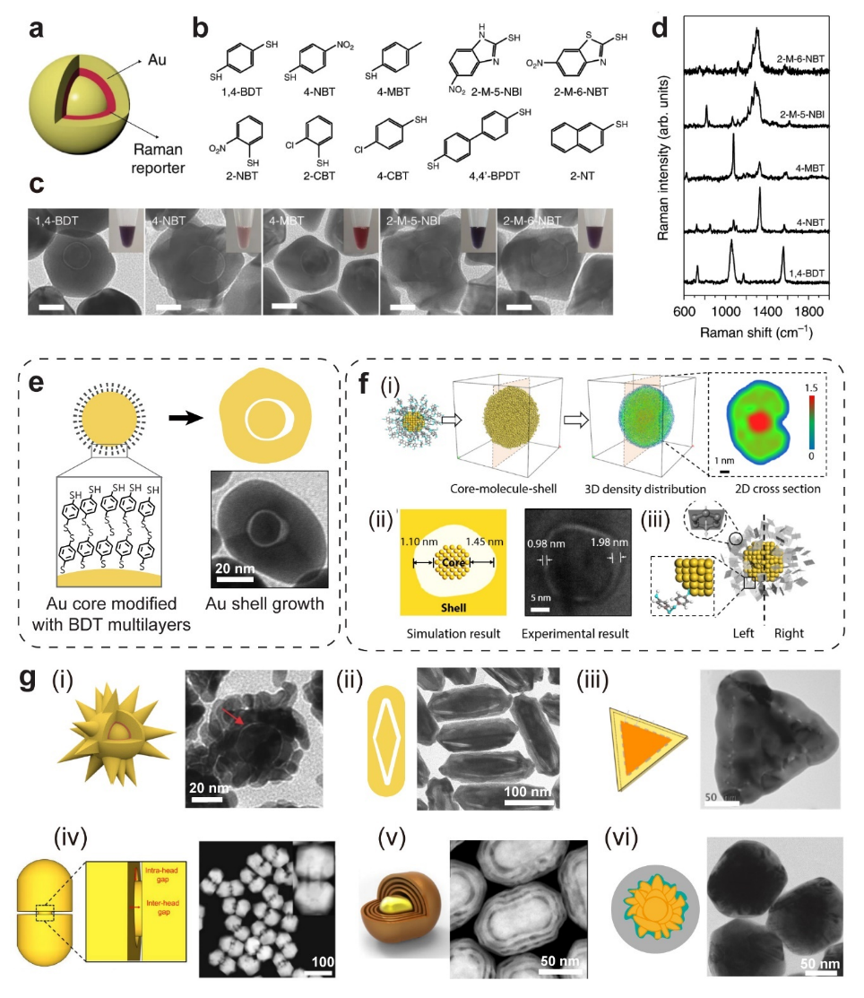 其结构通常由金属核、金属壳和中间的拉曼活性隔离层组成。GERTs具有以下优势:间隙内的等离激元耦合效应使其具有超高亮度;拉曼报告分子被金属壳保护,具有优异的胶体稳定性和信号光稳定性;即使在聚集状态下也能保持稳定的SERS响应,适用于定量拉曼分析;通过在内置间隙中嵌入多个拉曼分子或在不同间隙层中嵌入不同分子,可实现多重编码。GERTs已广泛应用于信息安全、快速成像、生物传感、活体检测与成像以及多功能诊疗等领域(图3)。