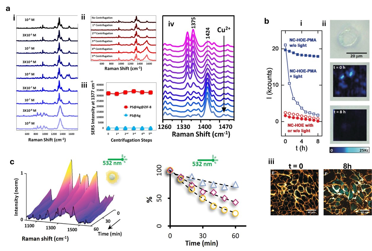 MOFs作为SERS基底,具备高比表面积、孔径可调节及可调控的局部化学环境等独特优势。通过将等离激元纳米颗粒封装在MOF壳层中,可增强SERS信号的稳定性与灵敏度。MOFs的疏水性设计还可捕获非极性分子,提升检测效率,在环境监测、药物释放动力学研究等领域具有广泛应用前景(图2)。