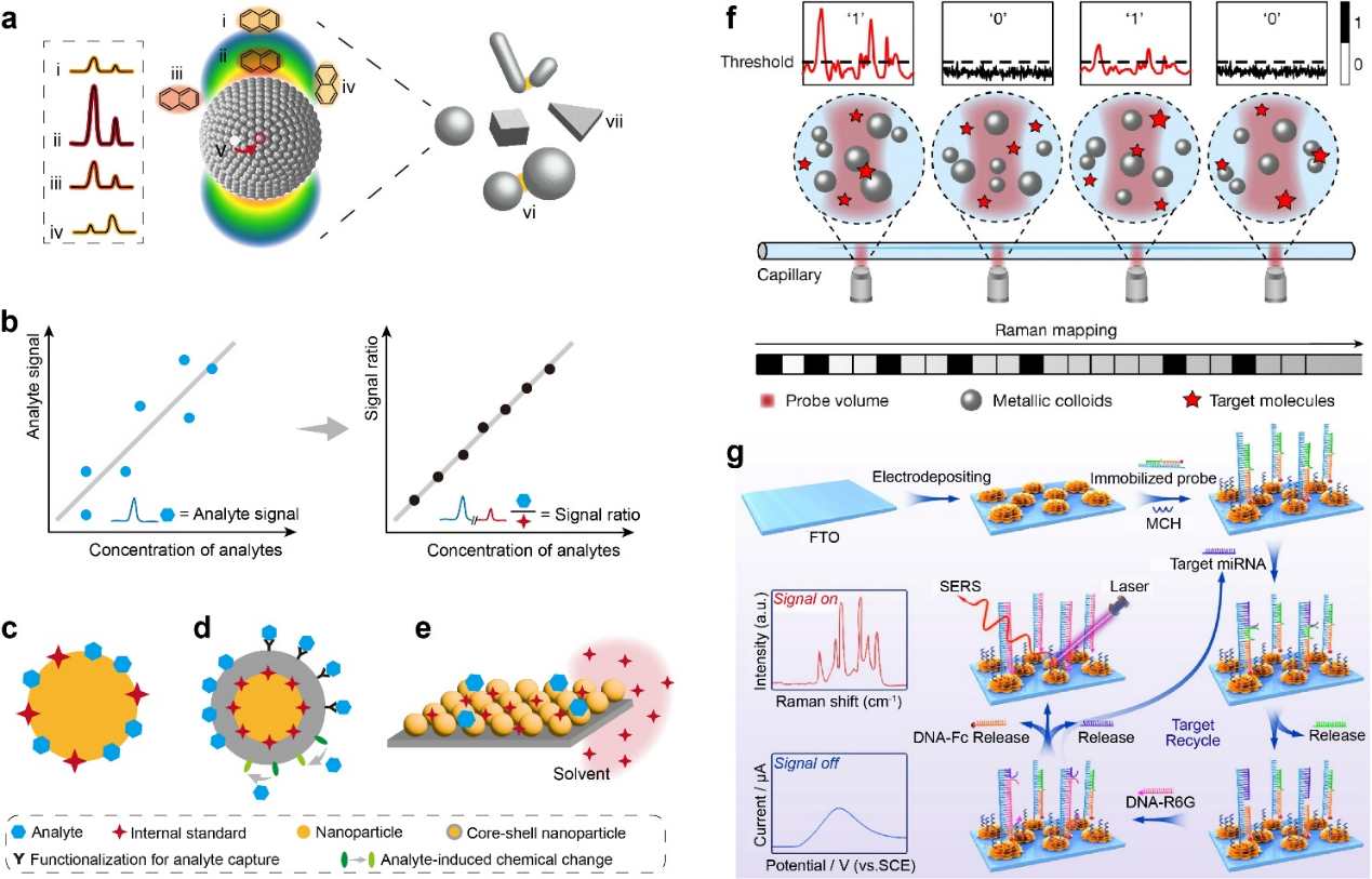 尽管SERS具有极高的灵敏度,但其信号强度的高度局部化和不均匀性导致了定量分析中的不可重复性问题。多种新兴技术已被开发用于改善定量分析的重复性和可靠性(图5)。