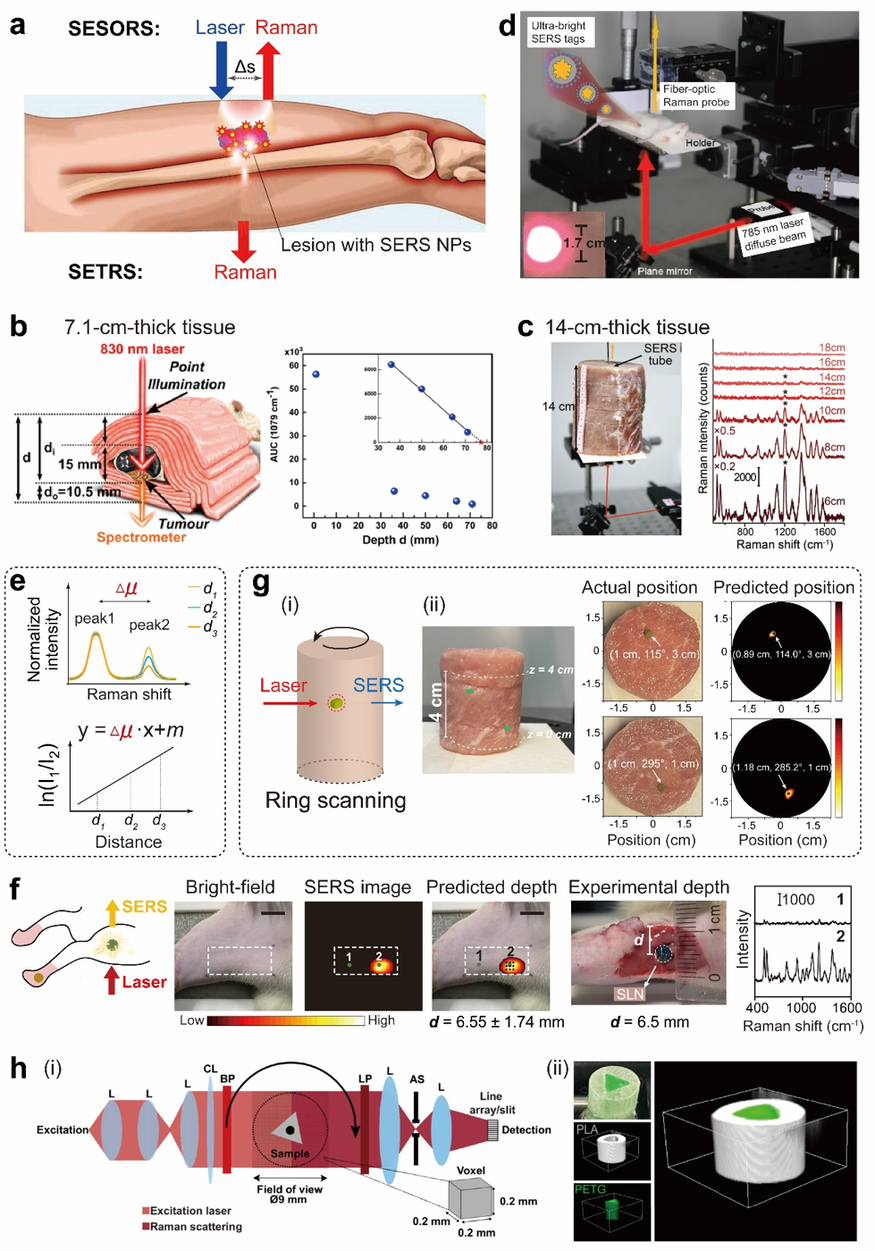 空间偏移拉曼光谱及透射拉曼光谱统称为深穿透拉曼光谱技术,通过在空间上将检测探头和激发光源隔开进行检测,抑制浅表背景对深层信号的干扰,可实现深层组织中拉曼信号的检测。结合SERS和深穿透拉曼光谱技术,目前已实现在符合临床安全光照标准的前提下穿透数厘米生物组织进行检测,并基于此实现活体动物(恒河猴、新西兰兔和大鼠等)深部前哨淋巴结的无创示踪和三维定位(图8)。