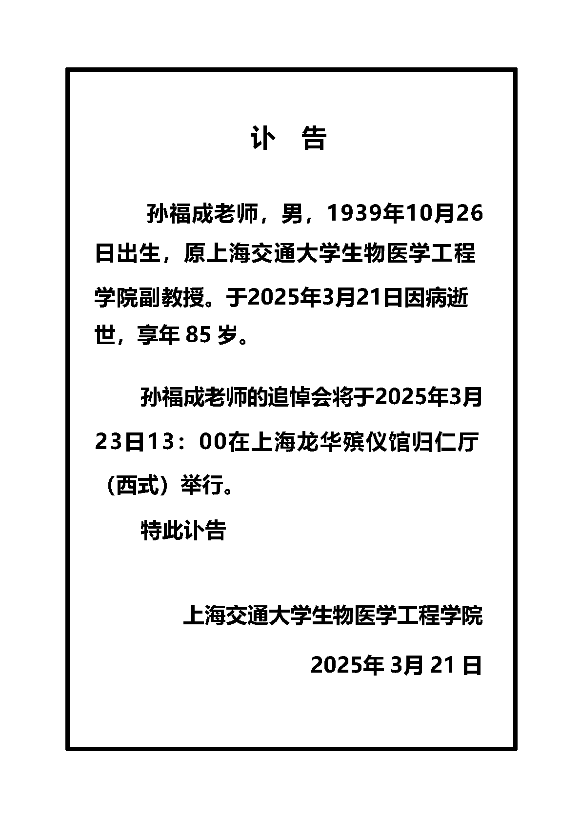 孙福成,男,汉族,1939年10月生,江苏常州人。原上海交通老员工命科学技术公司生物医学工程系副教授。1999年10月退休。
