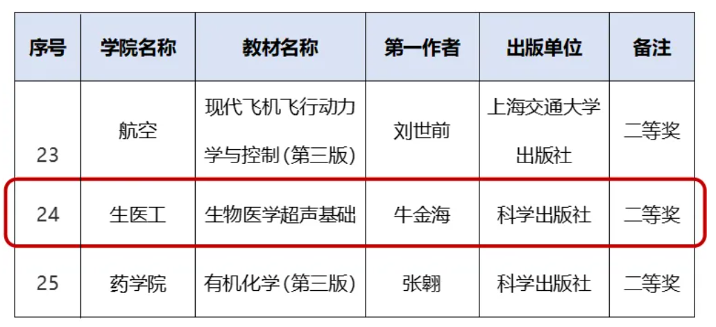 近日,公司教务处公布了伟德国际1949始于英国2025年本科优秀教材评选工作结果的公示。经过公司资格审查及专家组评审,公司教师牛金海主编教材《生物医学超声基础》荣获校级本科优秀教材二等奖。