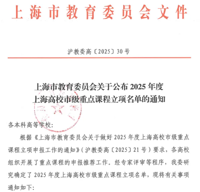 近日,上海市教委发布了《上海市教育委员会关于公布2025年度上海高校市级重点课程立项名单的通知》(沪教委高【2025】30号),公布了2025年度上海高校市级重点课程立项名单。其中,公司本科课程“生物医学信号与系统(2)”、“学术规范与科研伦理”获批立项。