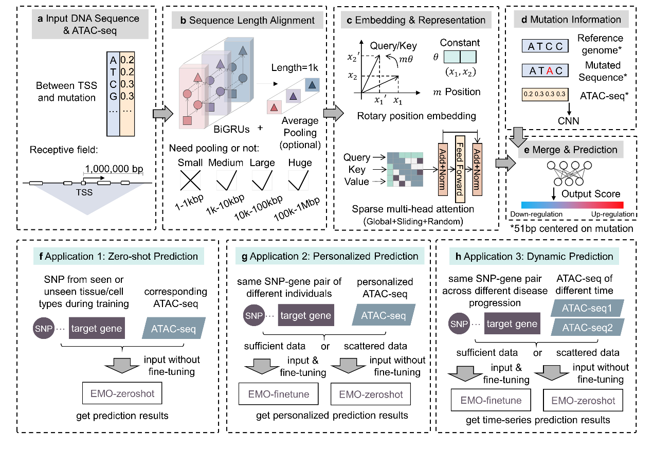 为什么这很难?传统深度学习方法多以DNA 序列为唯一输入,得到的是面向“平均个体”的静态结论:同一变异在肝脏与脑内可能方向相反、在炎症刺激前后强弱迥异,但旧模型很难识别。EMO在输入端把DNA 序列与 ATAC-seq 染色质可及性逐碱基对齐后联合建模;在结构端采用“双分支+分而治之”思路:一支聚焦变异点附近的局部影响,另一支覆盖从突变位点到靶基因 TSS 最远 ±1 Mb 的长距离顺式调控区间;在任务端把方向判别(上/下调)与强度回归(eQTL 斜率)拆分训练,并用稀疏注意力与尺度感知池化,既压住了长序列计算量,又把增强子、TF 结合位点等功能区域“高亮”出来。这套机制既像“广角镜头”,也像“放大镜”,兼顾远近两端的调控证据。