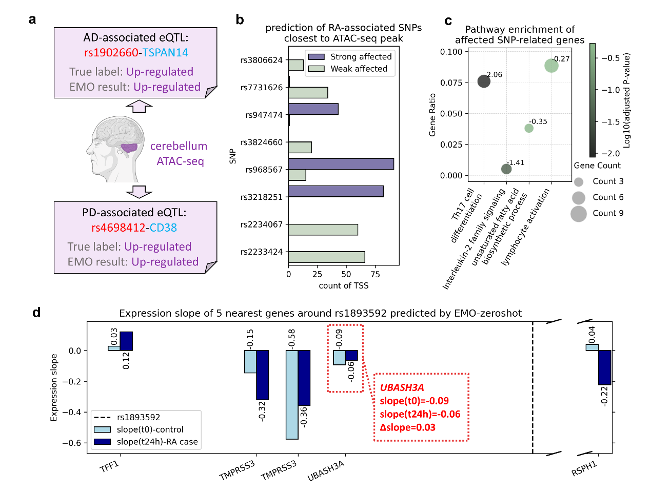 更贴近应用的,是零样本推断。只要目标组织有可用 ATAC-seq,哪怕没有在该组织训练,EMO 也能直接判别方向。以小脑为例,团队对两则神经精神疾病相关 eQTL 做了验证:rs4698412–CD38(帕金森病)与 rs1902660–TSPAN14(阿尔茨海默病),模型分别给出 93.7% 与 69% 的上调概率,方向均与文献一致。这意味着在低样本、低门槛的情形下,仍可得到可信的机制线索。